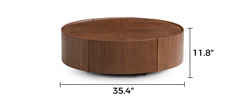 This elegant Caleb round coffee table features seamlessly integrated storage drawers, offering a sleek solution to keep your space clutter-free. Crafted from rich wood with a refined grain pattern, it blends functionality with timeless aesthetics.