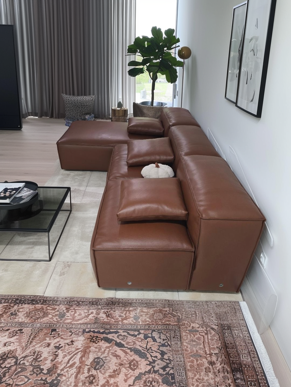 With its sculptural blocky silhouette and generously padded structure, this sofa offers a perfect blend of modern aesthetics and inviting softness. The wide, structured armrests double as a cozy headrest or a handy spot for your book or cup—designed for both lounging and living.