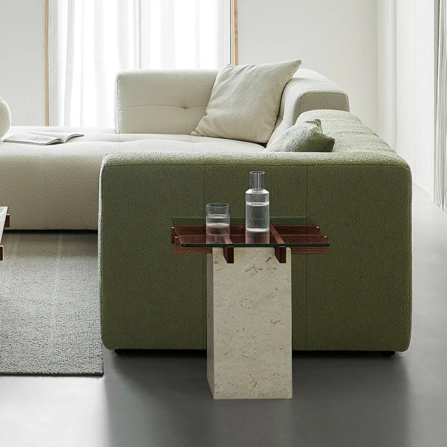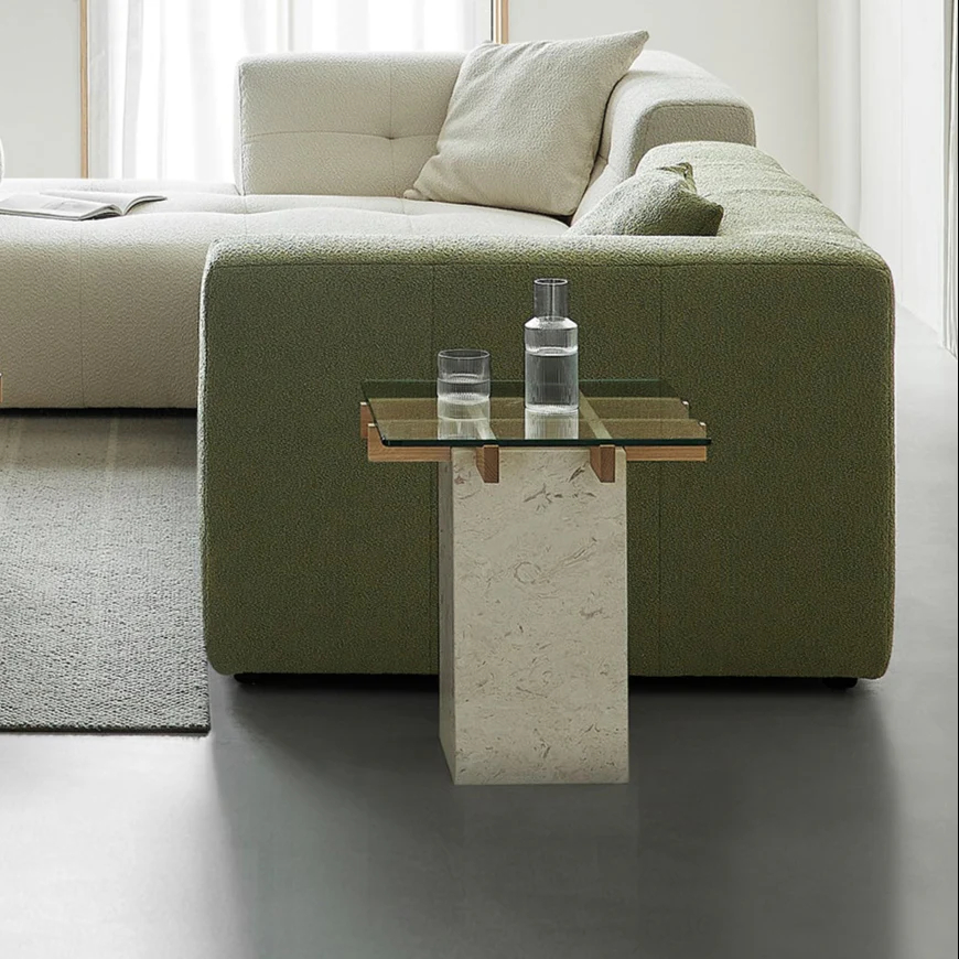 Features a Nordic-inspired design, with a square transparent glass top and a marble base that seamlessly combine to create a distinctive three-dimensional architectural look. Its minimalist, modern shape complements a variety of home styles, providing both functionality and artistic elegance, making it the perfect choice for enhancing your home décor.