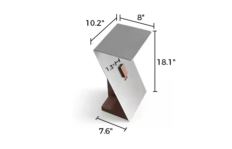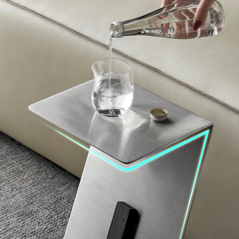 This stainless steel side table showcases a minimalist modern design with a compact and stylish silhouette, exuding a sense of cutting-edge technology and futuristic appeal. Its sleek form and innovative design seamlessly align with the needs of contemporary interiors, offering both practicality and a bold visual impact.