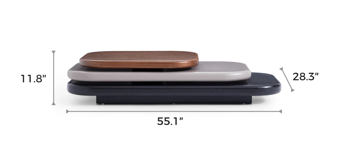 This modern artistic Pebbles Rotating Coffee Table features a unique overlapping structure, creating a dynamic atmosphere. Pebbles Rotating Coffee Table is composed of three stacked elements in black, gray, and walnut, delivering a stunning visual impact. Each layer's smooth, rounded edges enhance its contemporary charm, while the combination of materials brings a sense of balance and harmony. Practical with ample surface space to display your favorite items, it also serves as a multifunctional centerpiece, elevating the style of any living space.