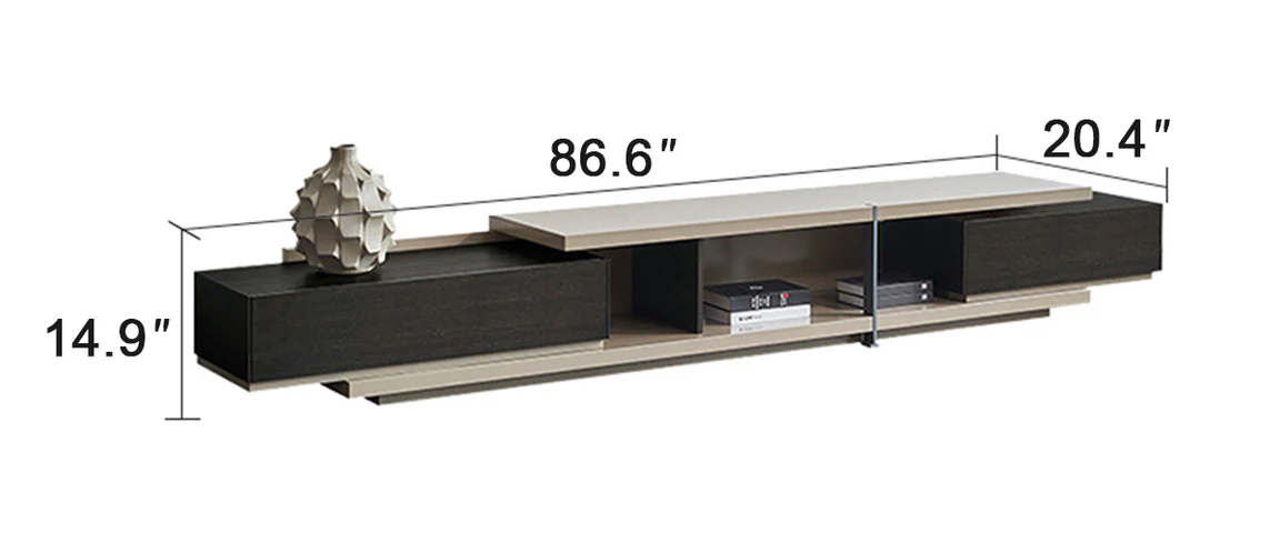 This TV stand pairs E0-grade smoked panels with a gray-and-ivory contrast finish to bring visual depth and a refined tonal balance to your home. The extendable length (up to 2.6 meters) lets you customize the layout to suit different room sizes and TV formats, ensuring both beauty and practicality. Its sleek, layered form adds a subtle floating effect, giving your living room a modern, sculptural presence without overwhelming the space.