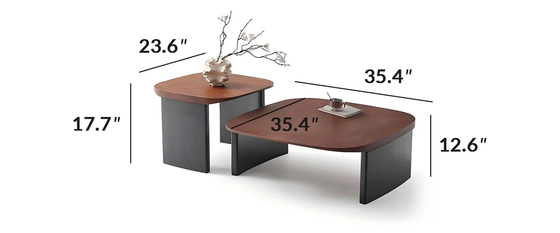 This nesting coffee table set combines soft curves with bold contrast, creating a refined yet modern centerpiece for your living room. Featuring rounded wood tops with a warm walnut finish and distinctive black arc-shaped legs, the set blends natural elegance with architectural strength. The two tables can be arranged together for a layered look or used separately to fit your space and needs, offering both versatility and timeless style.
